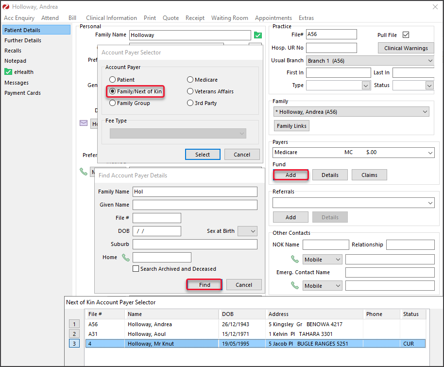 Add another person to a patient's record as a payer. This can be a family member or a next of kin, which is a relation of the patient who is not a registered patient (i.e. not part of a Family group).