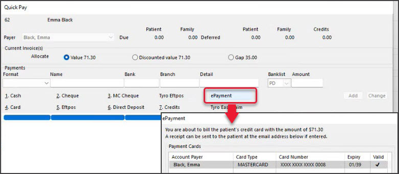 If you book an Appointment, a credit card icon on the Appointment Details screen tells reception the patient has a card on file. This icon also shows in the Appointment Grid and the Waiting Room. After the consultation, the patient will be billed using Zedmed’s ePayment option. All cards provided by the patient for Payment Gateway can also be viewed with their expiry date in the Payment Cards menu in patient details.