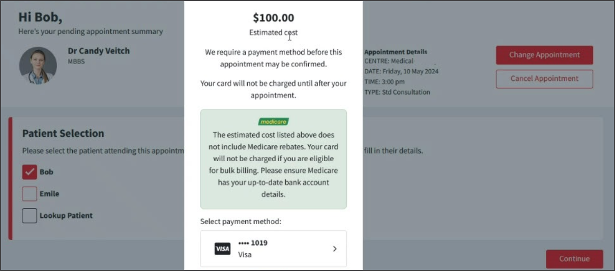 The first time a patient makes a booking, they can be asked to provide a credit card. When the appointment is booked, the patient's card is charged then refunded $1. Once a card is recorded in Patient Details, the patient will not be prompted again. The practice can display any applicable fees and an estimated consultation cost in OLA. To learn more, see the OLA with Payment Gateway guide.