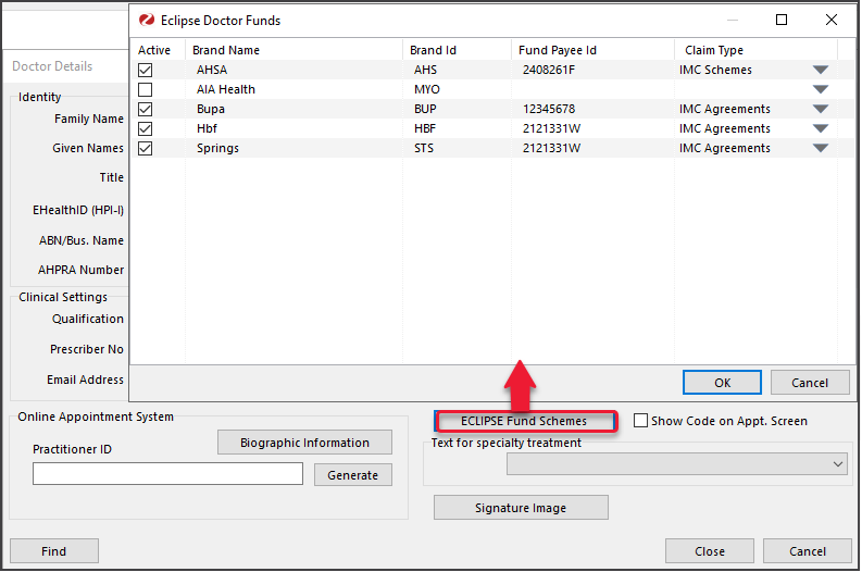 The screen will display the funds set up in Zedmed. - Tick a fund to make it active for the doctor.