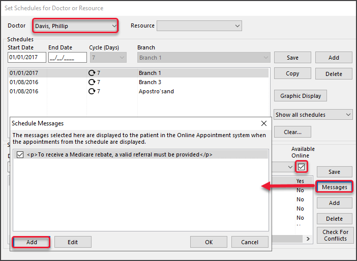 You now have a message that can be applied to any doctor's schedule. - Tick the box next to the message to apply it to the selected schedule.