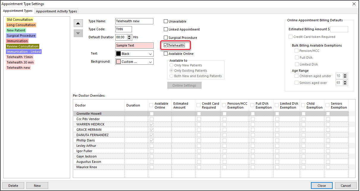 - In the Appointment Type options, tick Telehealth.
