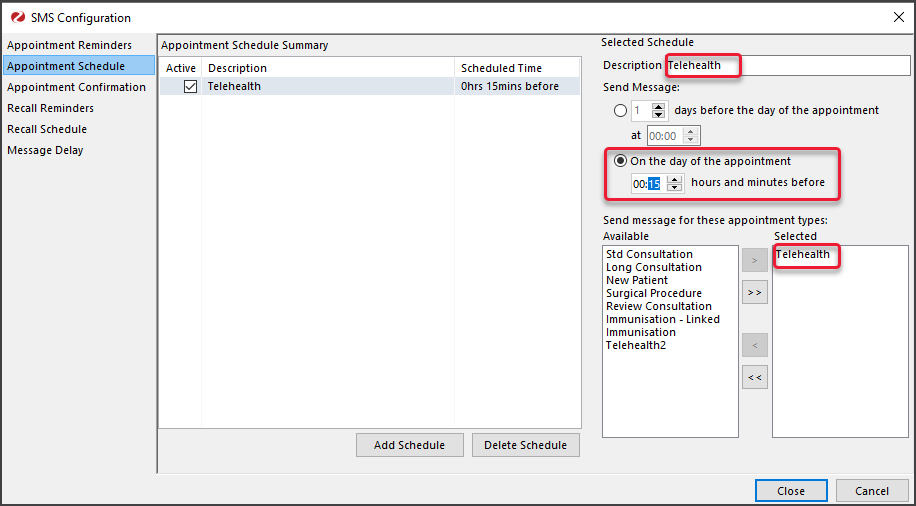 We suggest selecting a time not long before the appointment to stop the patient from initiating the appointment early. - Select Close to save the schedule.
